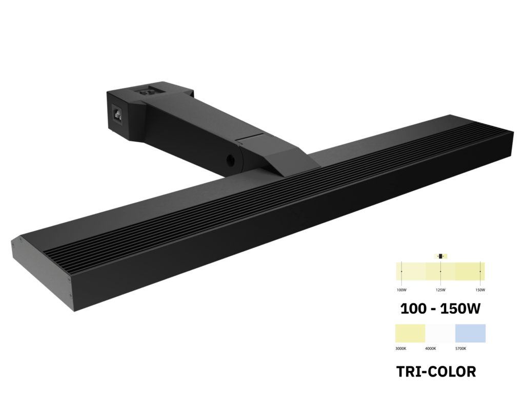Le sélecteur Tri-Color permet de régler facilement la lampe sur différentes températures de couleur (3000, 4000 ou 5700K). Le deuxième interrupteur permet de faire varier facilement la puissance de la lampe en la réglant sur 100, 125 ou 150 watts. Ainsi, la lampe peut être utilisée à différentes hauteurs. De plus, la tête de la lampe est réglable jusqu’à un angle de 20 degrés pour perfectionner l’éclairage de la surface.