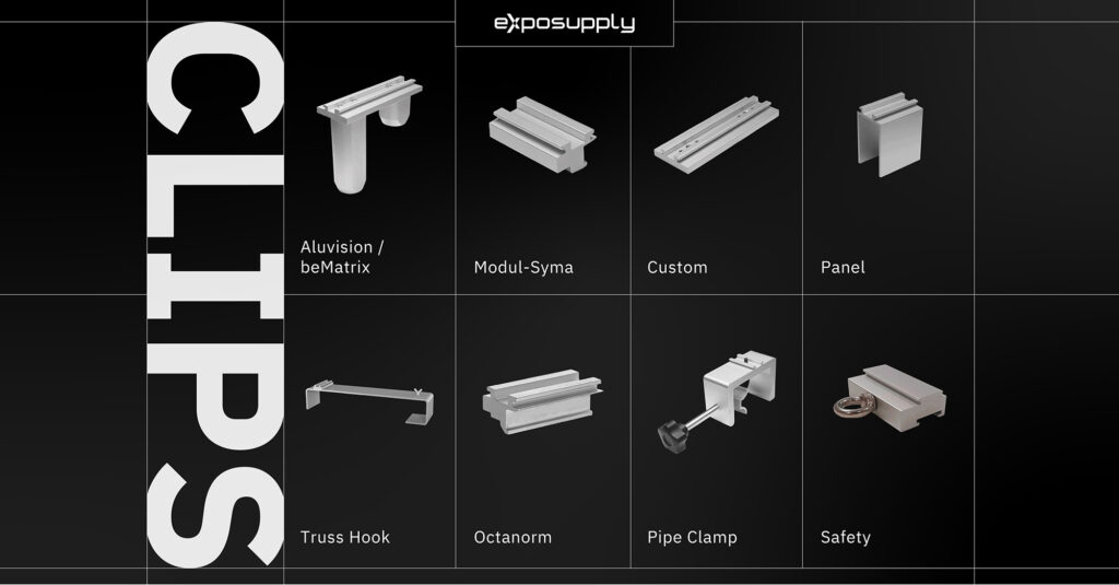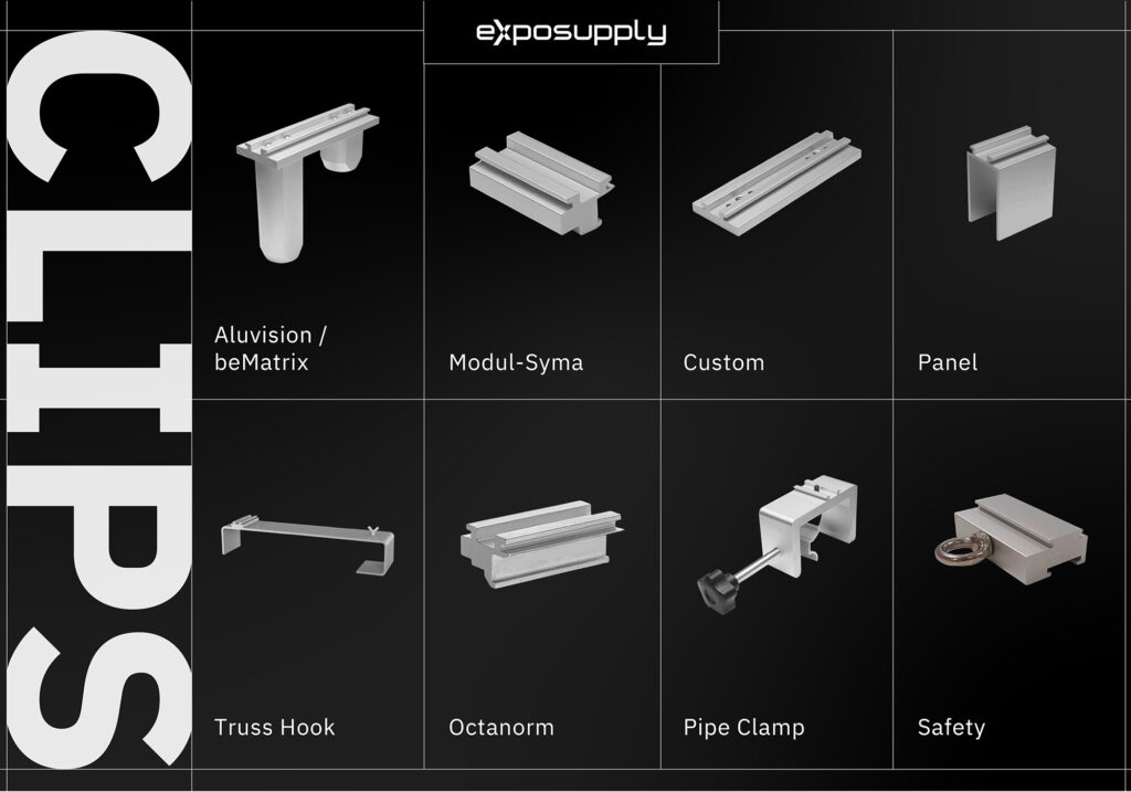 Grâce aux différents connecteurs / clips, le projecteur est fixable à tout système de construction de stands.