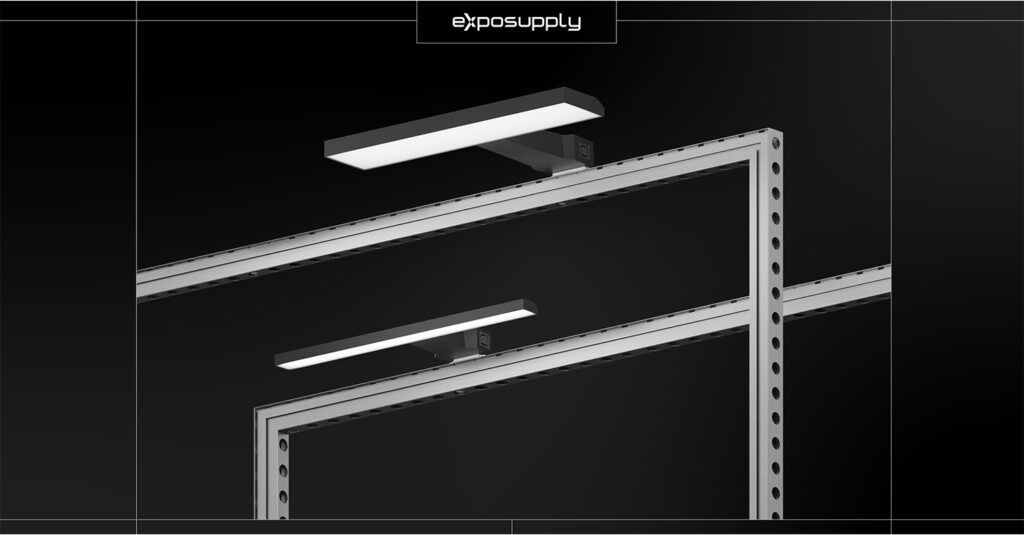 Avec les différents connecteurs de montage, nos projecteurs sur tige peuvent être utilisés sur tout système de stand d’exposition.
