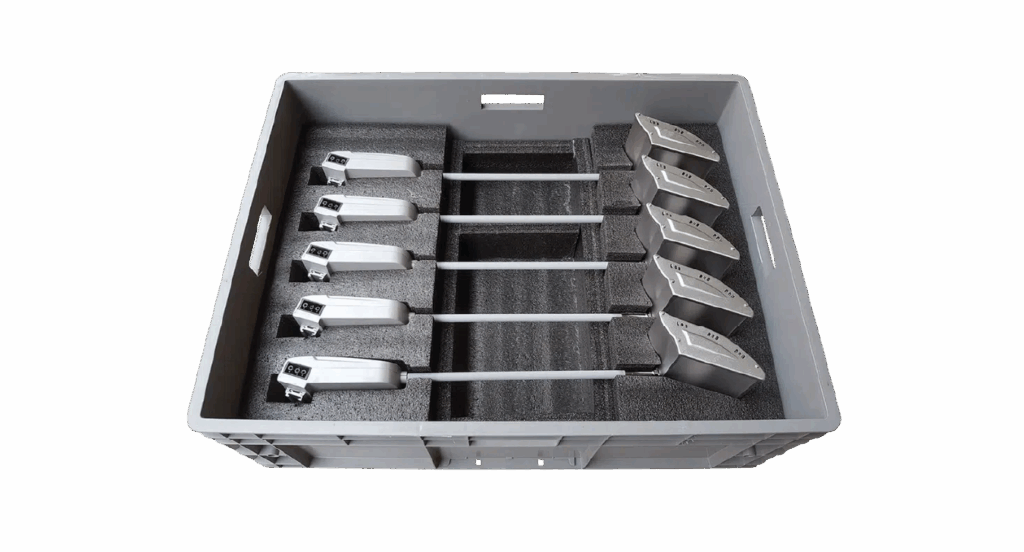 Caisse de transport et stockage robuste avec couvercle et mousse pour un transport sûr et facile, avec mousse découpée sur mesure. Espace pour 5 projecteurs sur tige, plus connecteurs de montage et câbles.